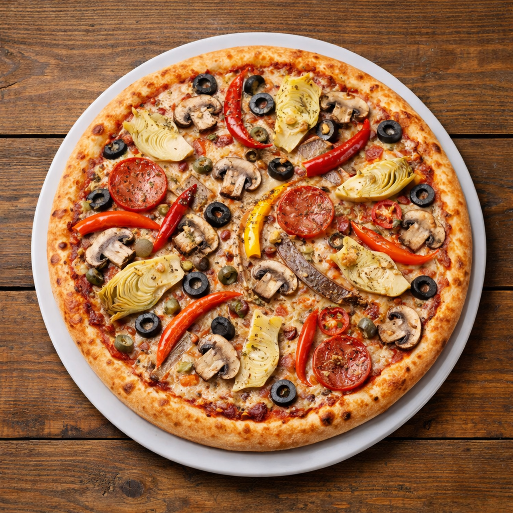 Tomaten, Käse, Champignons, Paprika, Artischocken, Oliven und Peperoni (scharf)
