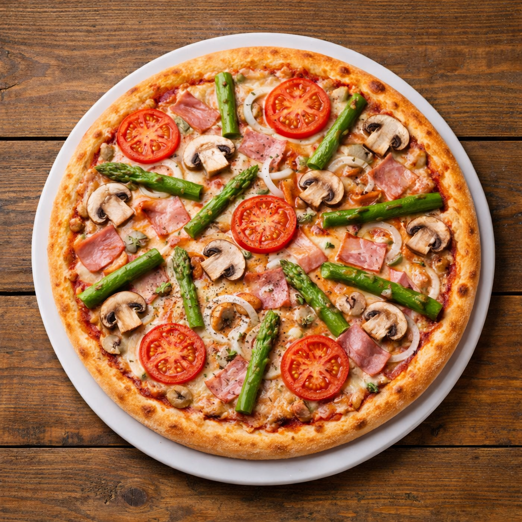 Tomaten, Käse, Spargel, Zwiebeln, Formfleischvorderschinken und Champignons