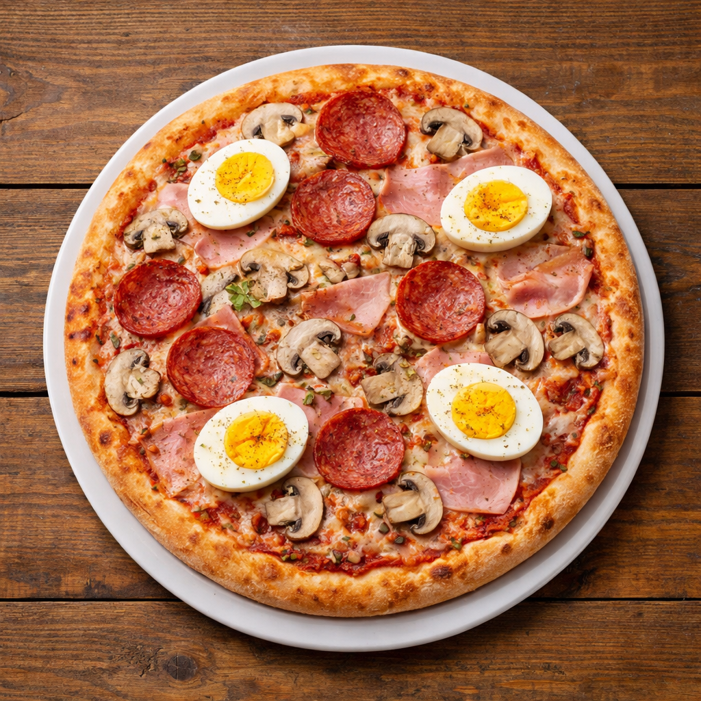 Tomaten, Käse, Champignons, Salami, Ei und Formfleischvorderschinken